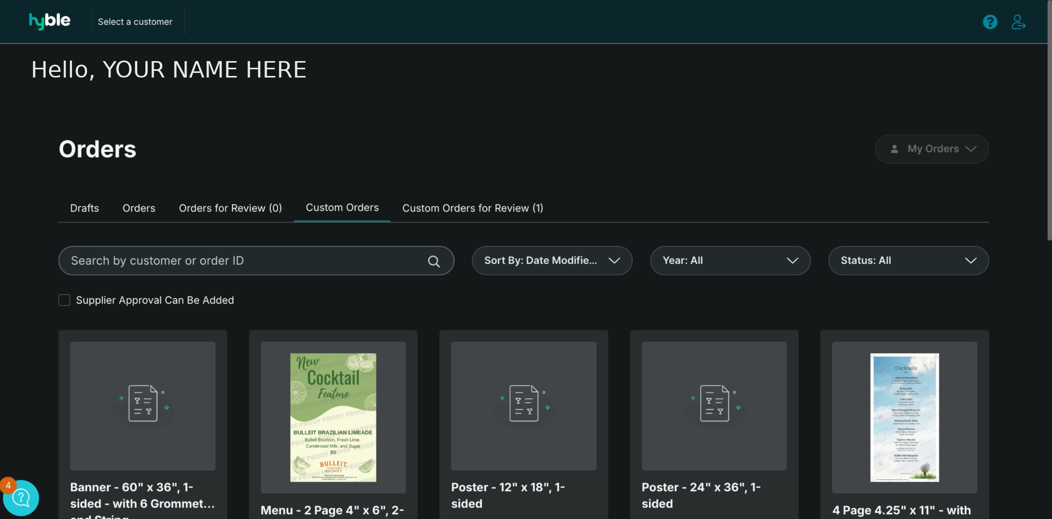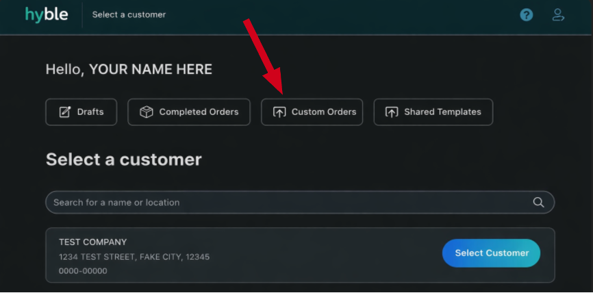 From the Hyble homepage, select Custom Orders.