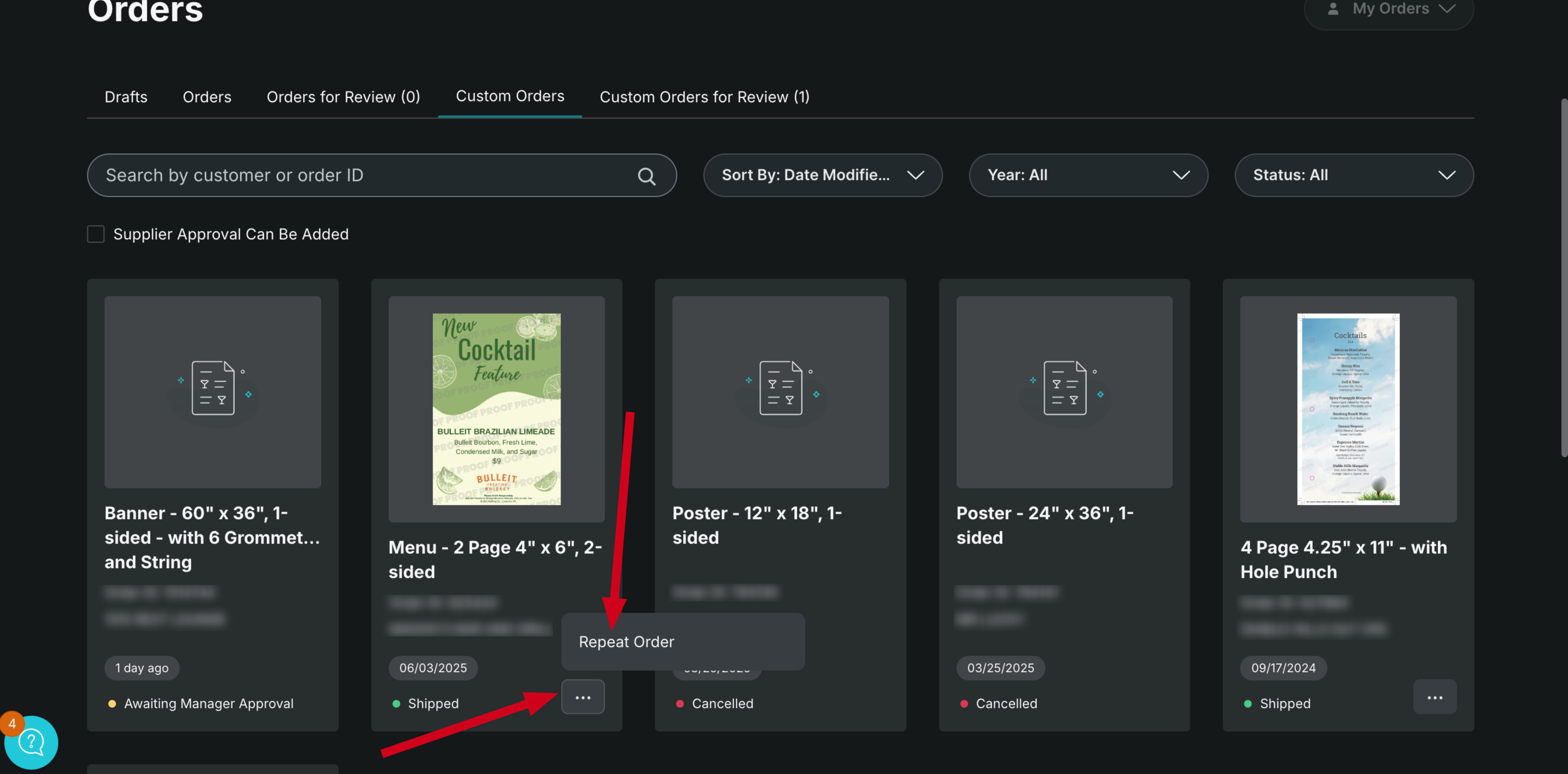 Locate the Custom Order you want to repeat