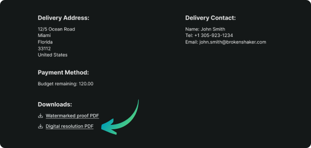 - Access from the Order Summary Page: Once your order is approved and rendered, the low-res PDF can be accessed in a new “Downloads” section within the order summary page.